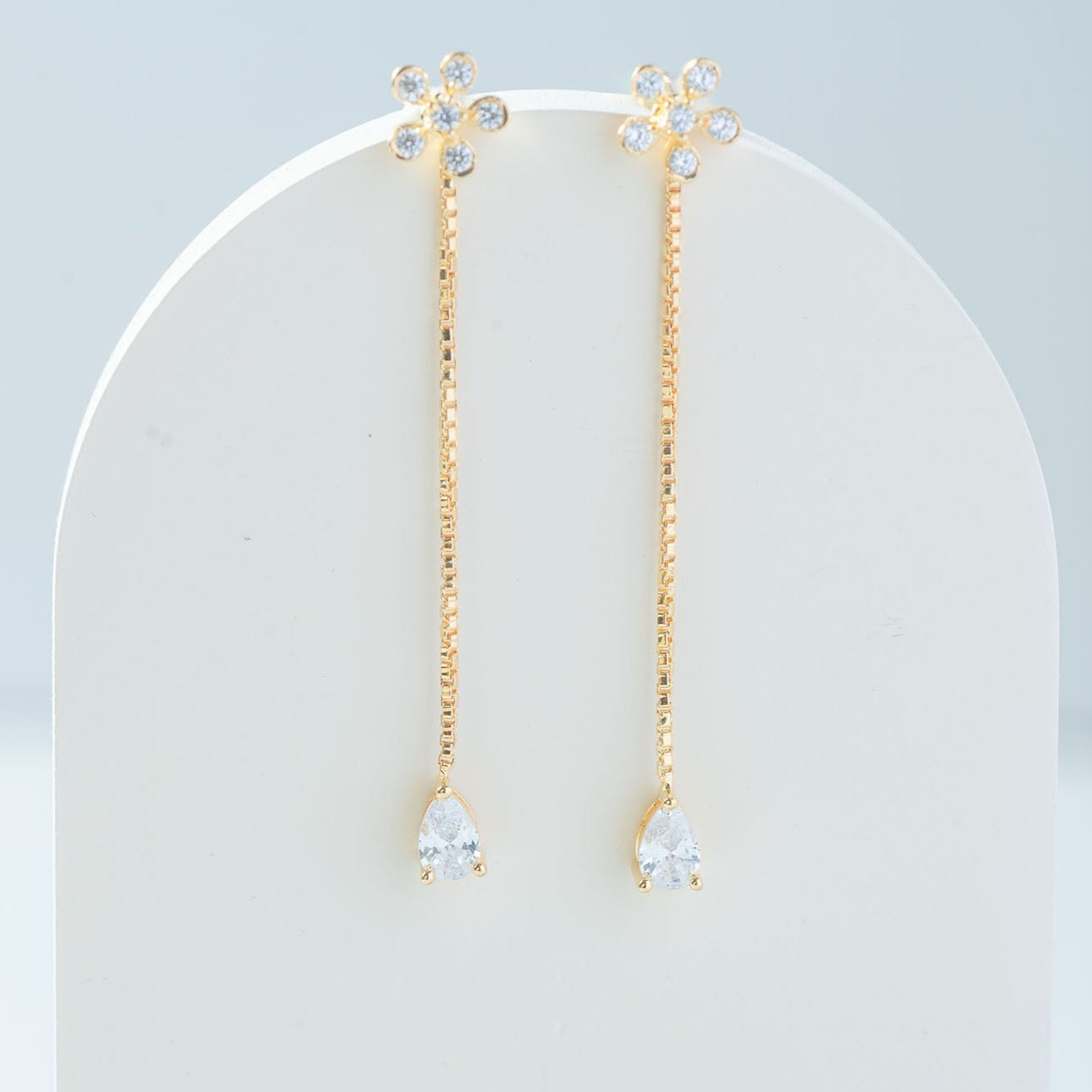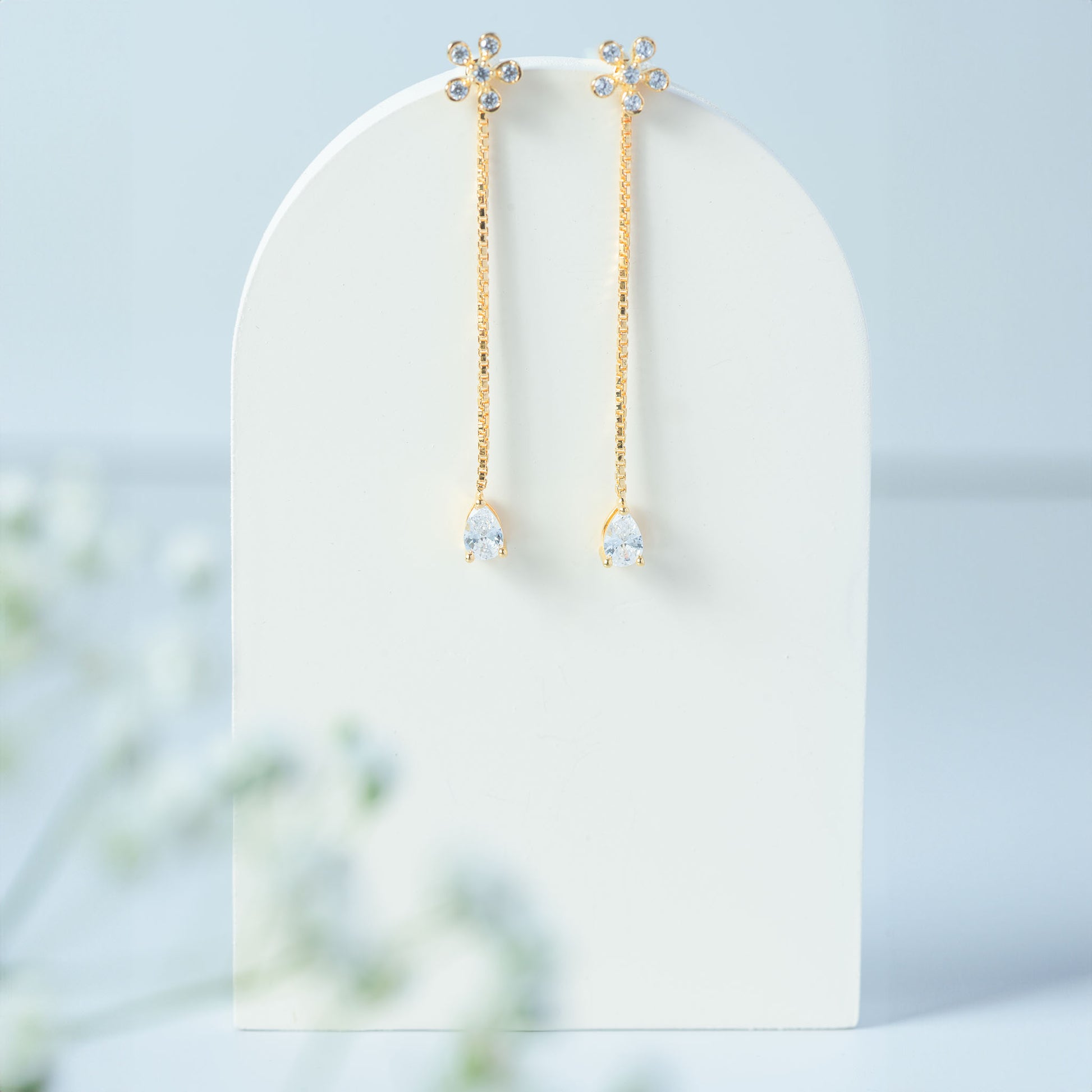 To maintain the brilliance of your Golden Floral Drop Earrings , avoid exposure to moisture and harsh chemicals and clean regularly with a soft, lint-free cloth. Store in a cool, dry place, preferably in a jewelry box or pouch provided with your package.
