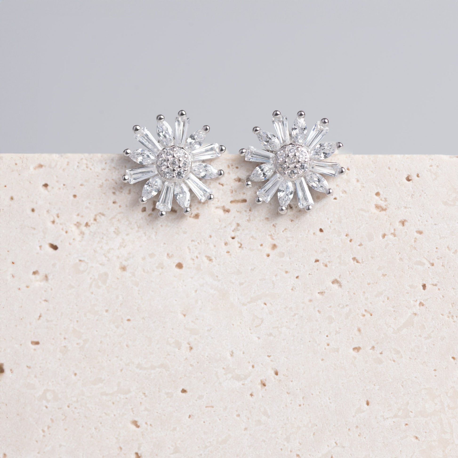 - Design: Sunflower-shaped stud earrings with alternating marquise and baguette-cut petals.