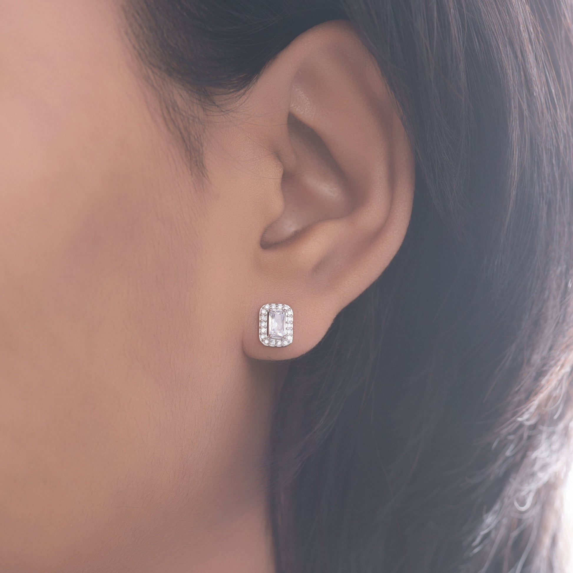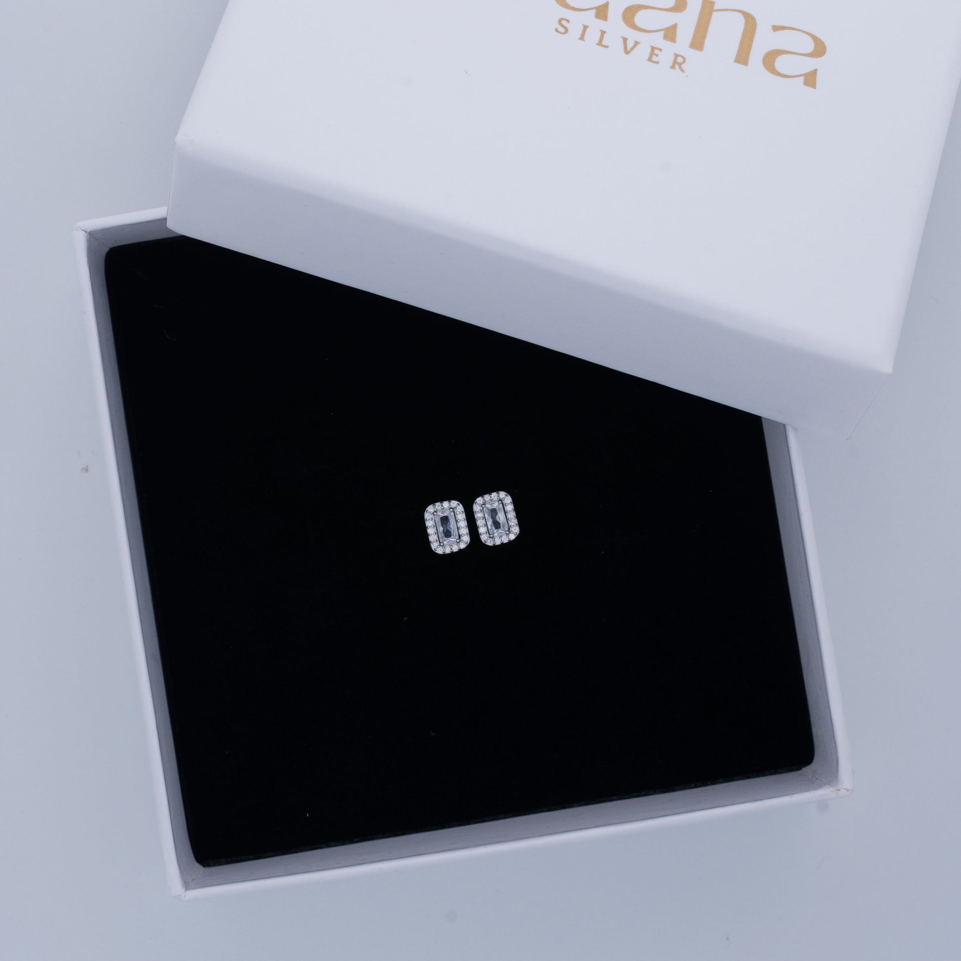 A symbol of grace and timeless elegance, the Vera Halo Studs exude a refined charm that effortlessly complements any look. Featuring a 5mm × 3mm baguette-cut AAA-grade CZ stone at the center, these earrings radiate a sophisticated glow. The delicate halo of 1mm round stones surrounding the centerpiece enhances its brilliance, creating a luminous effect. Designed in 925 sterling silver, these lightweight studs (just 1g per pair) offer the perfect balance of elegance and comfort. The Vera Halo Studs are the perfect blend of minimal elegance and luxurious sparkle, making them an essential addition to any jewellery collection.
